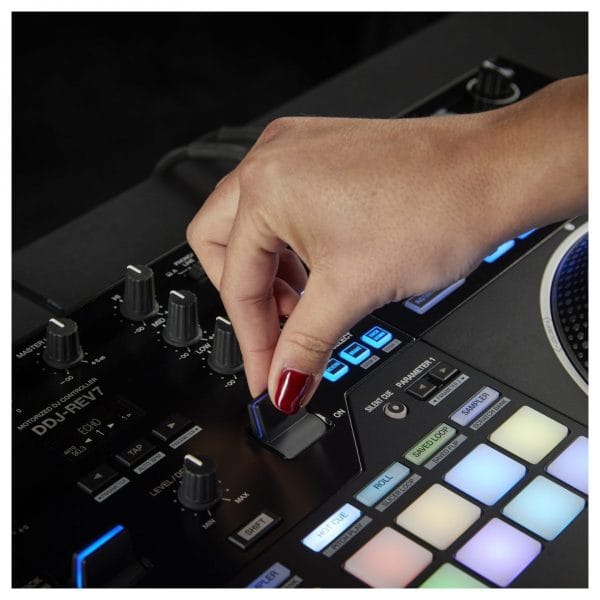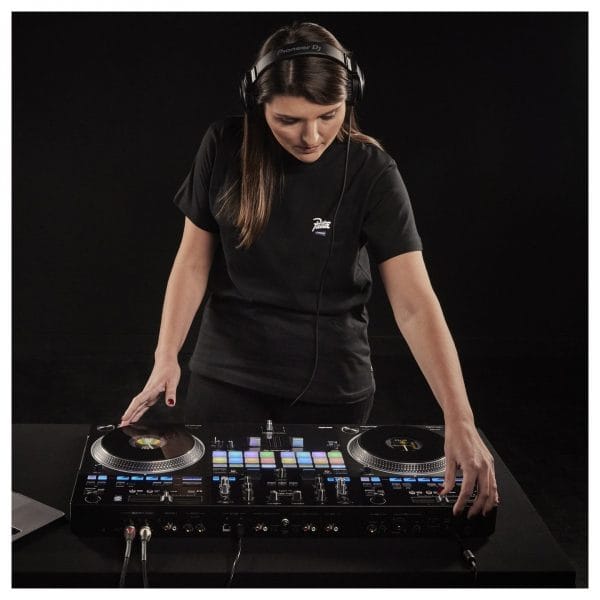 You can also customise the feel of the jog wheels, thanks to the unique three-tier design that utilises two slip sheets inside of each deck, allowing you to choose your preferred amount of friction. You can also change the torque of the jog wheels with high and low torque settings. You can even adjust the Stop Time of the jog wheels, dictating how long the music takes to finish when you press pause. It also comes with all the bell and whistles you’d expect including onboard performance pads, three-band EQ on each channel, onboard filtering and Lever FX. The DDJ-REV7 also comes equipped with the Magvel Fader Pro – one of the most renowned faders ever created and perfect for scratching.